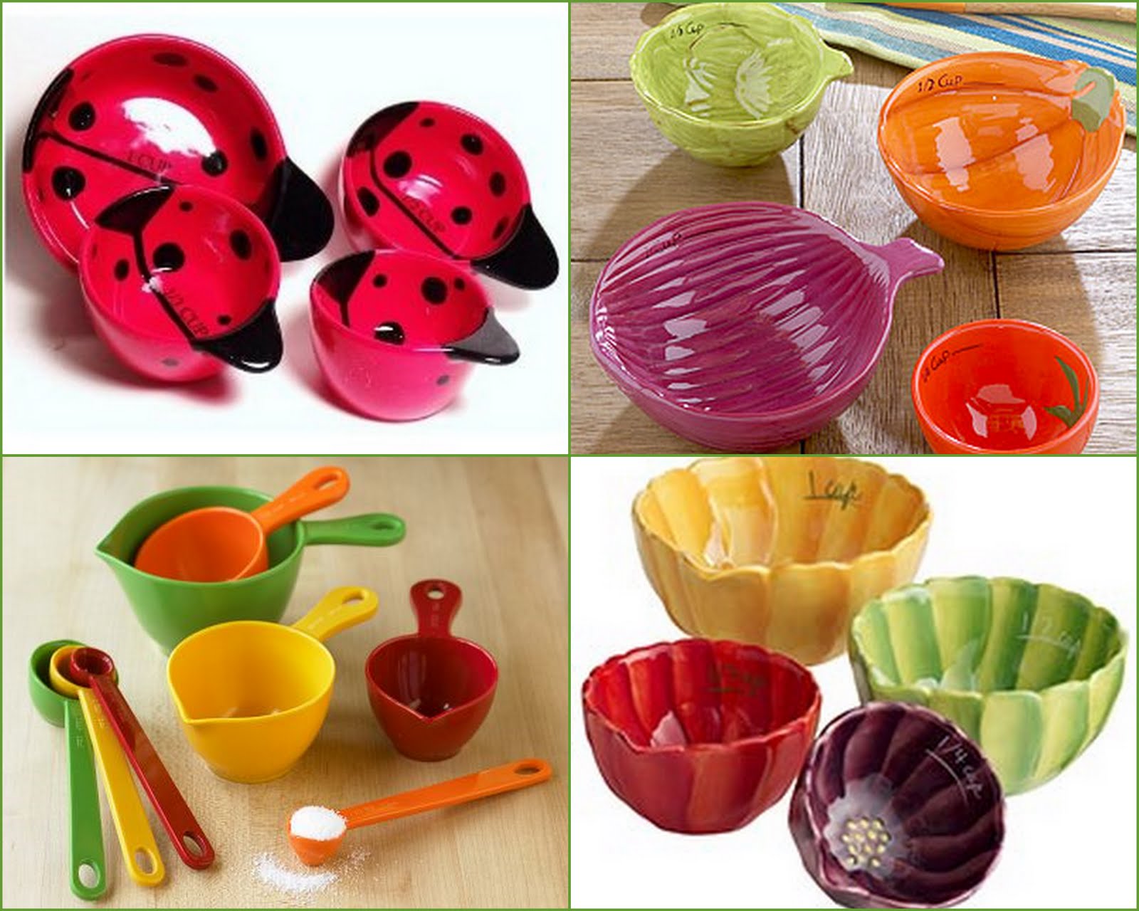 I found these 4 different measuring cups fun and pretty and far from boring. If you have to register or buy a boring old kitchen gadget, it might as well be funky and colorful.